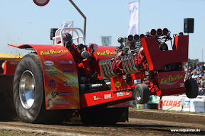 Runter mit dem Motor und warten auf die 2,5t. Dort zogen wir als vierter Starter den zweiten Full Pull der Klasse und waren mit Roude Leiw Jr., Green Spirit VII (‚NL) und Black Power (DK) im Stechen. Der amtierende Meister Roude Leiw legte 100,06 Meter vor. Für den Red Painter leider nicht zu erreichen, da nach 50 Metern eine Methanolleitung vom Blower abriss. Glück im Unglück dass auch Green Spirit VII mit Problemen zu kämpfen hatte und Black Power im Pull Off nicht antrat. Somit reichten 59,35 m für den zweiten Platz.